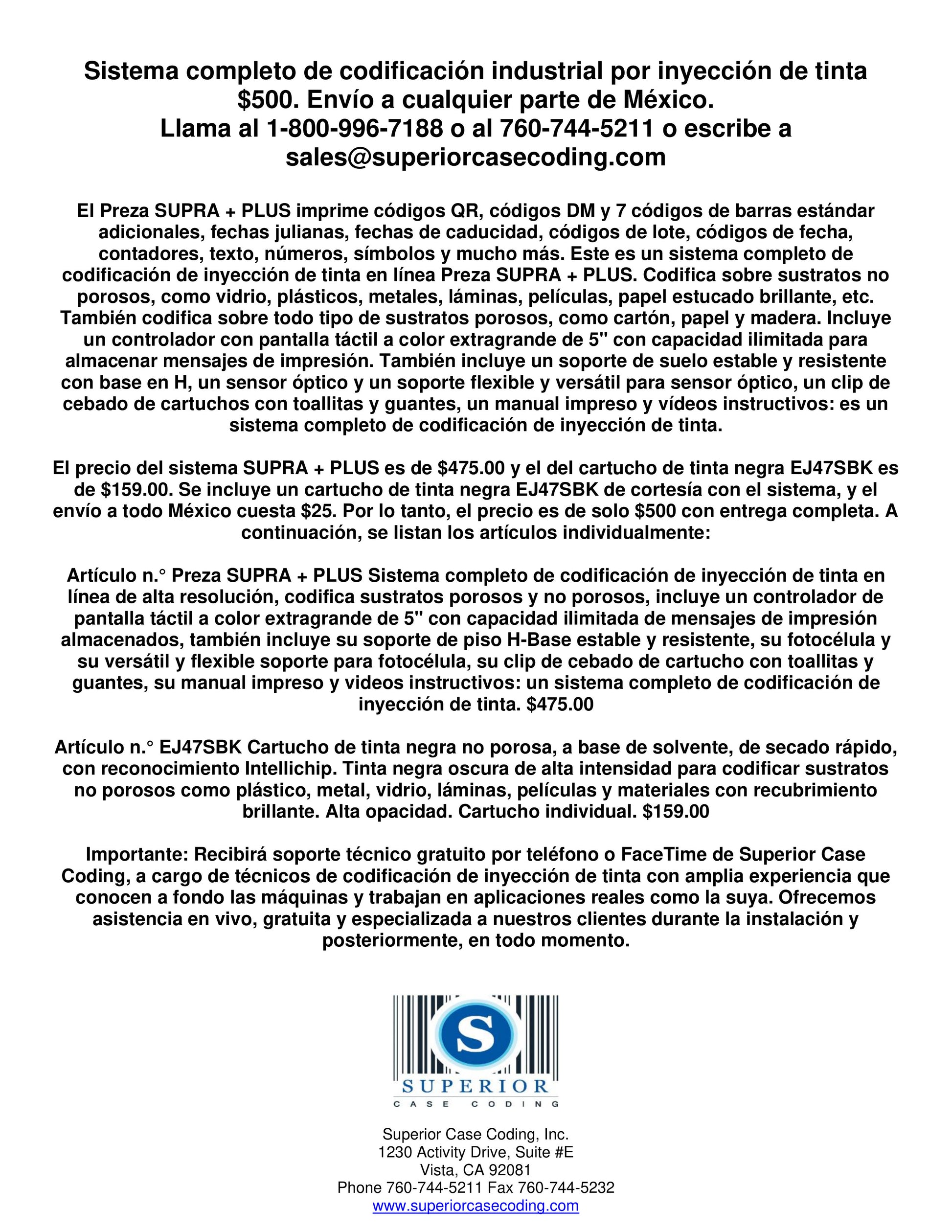 Llama al 1-800-996-7188 o al 760-744-5211 o escribe a sales@superiorcasecoding.com